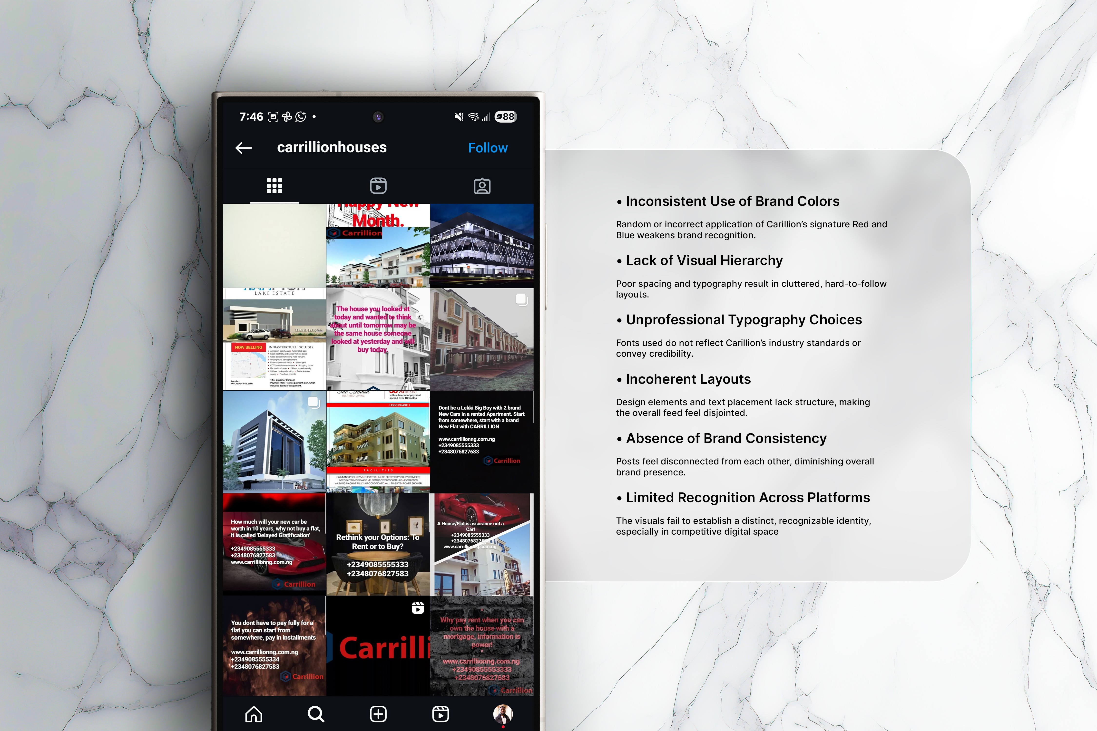 However, Carillion’s social media lacked consistency, brand structure, and the professional standard expected from a leading real estate and construction company. Despite Carillion’s reputation for delivering quality projects, their social media presence failed to reflect that credibility. The designs were outsourced, resulting in weak visuals, inconsistent use of color, and a fragmented brand identity across digital platforms. This diluted their professional image and made it harder for audiences to recognize or trust the brand online